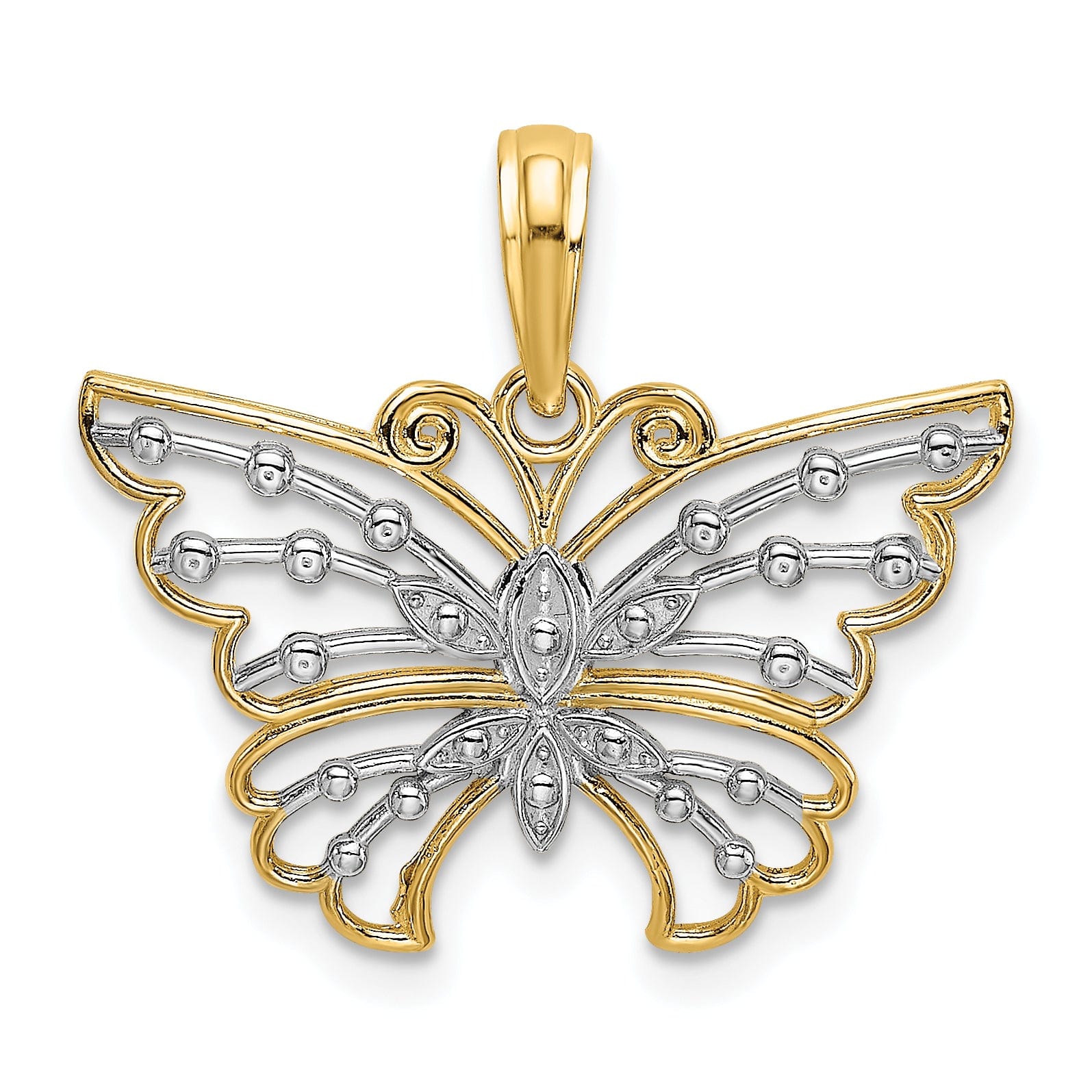 这款14K黄白金D.C花式设计蝴蝶吊坠不仅是一件珠宝,更象征着蜕变与美丽。无论是犒赏自己,还是为挚爱挑选礼物,这款吊坠都必将带来喜悦与优雅。用这款充满自由与创造精神的迷人蝴蝶吊坠,庆祝生命中珍贵的时刻。立即用这件迷人之作提升您的珠宝收藏!